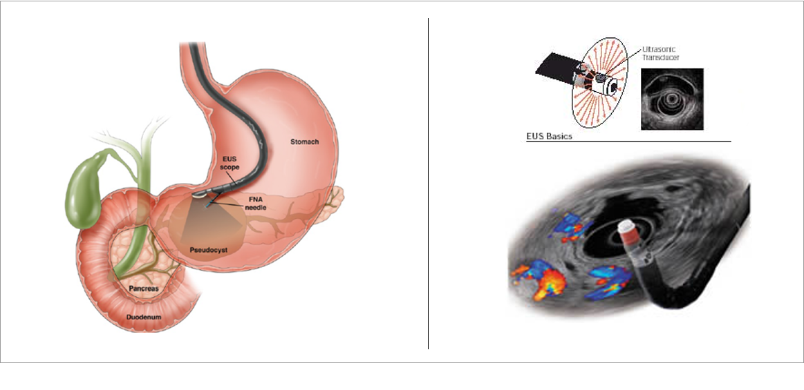 Endoskopik Ultrasonografi (EUS) hem sindirim sisteminin iç yüzeyini görür, hem de duvarın katmanlarını ve duvarın arkasındaki organları görür. Bir anlamda EUS duvarın arkasını görebilmektir.