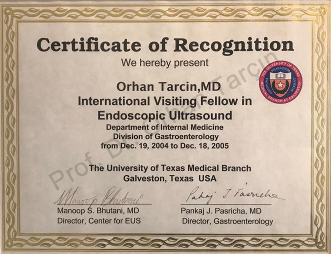 Prof. Dr. Orhan Tarçın, ‘Endoskopik Ultrasonografi’ konusunda resmi olarak bir yıl ‘Texas Üniversitesinde (UTMB) ‘üst uzmanlık eğitimi almış olup 2005’den beri endoskopik ultrasonografik işlemleri uygulamaktadır. Son 8 yıldır ‘ Endoskopik Ultrason Çalışma Grubu Başkanlığını (TÜRKEUS ) yürütmektedir.